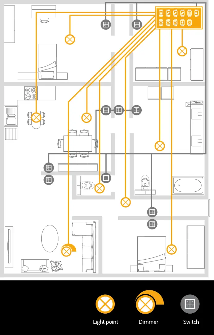 - Each light, socket, or device is wired directly to the electrical cabinet.